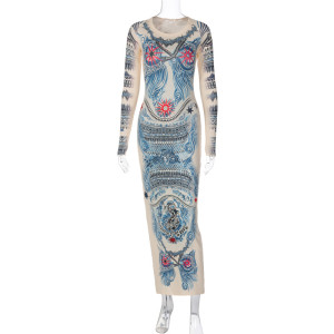 Long Sleeve Round Neck Printed Maxi Dress Fashion Slim Dress